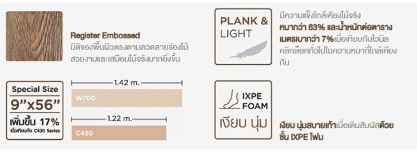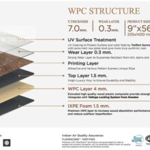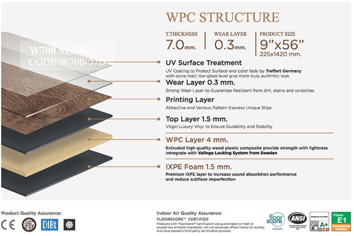 พื้นไวนิล WPC (Wood Plastic Composite Vinyl) ผลิตจากใยไม้ และ โพลิเมอร์พลาสติก และ แผ่นโฟมรองพื้น IXPE ความหนา 7 มิลลิเมตร ให้ความรู้สึกเหมือนไม้จริง ด้วยลวดลายของร่องไม้ ทำให้ดูสวยงาม และ ดูหรู และมีน้ำหนักเบา เป็นทางเลือกสำหรับลูกค้าที่ต้องการความเป็นธรรมชาติของพื้นไม้ นำไปติดต้ังบริเวณ ห้องครัว, พื้นบ้านชั้นล่าง, ห้องนอน, ห้องทำงาน, ห้องออกกำลังกาย หรือ ห้องโถง ที่ต้องการความหรูหราสวยงาม มีสีให้เลือก 8 สี สามารถตกแต่งห้องต่างๆในบ้าน และ โครงการต่างๆ ได้อย่างสวยงาม